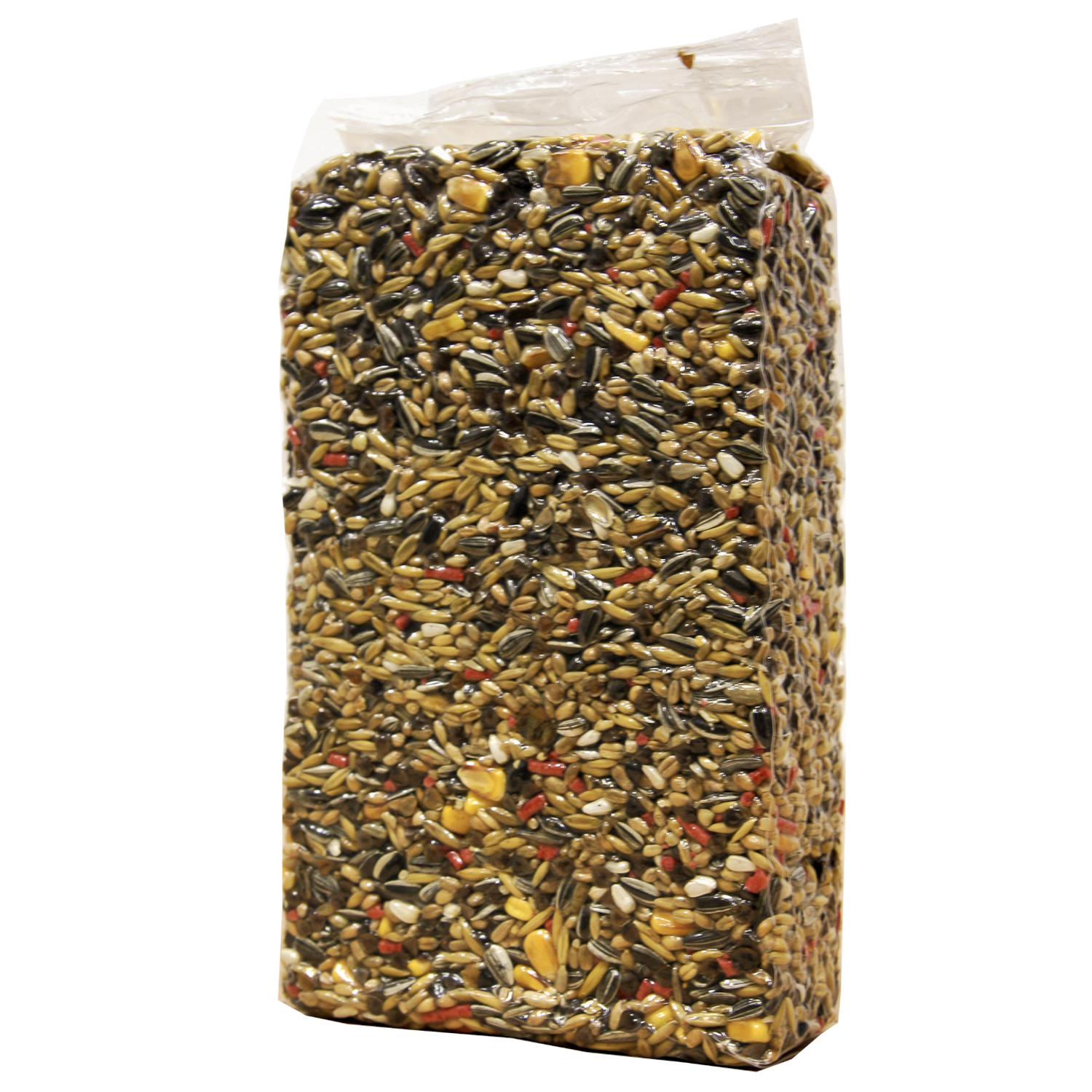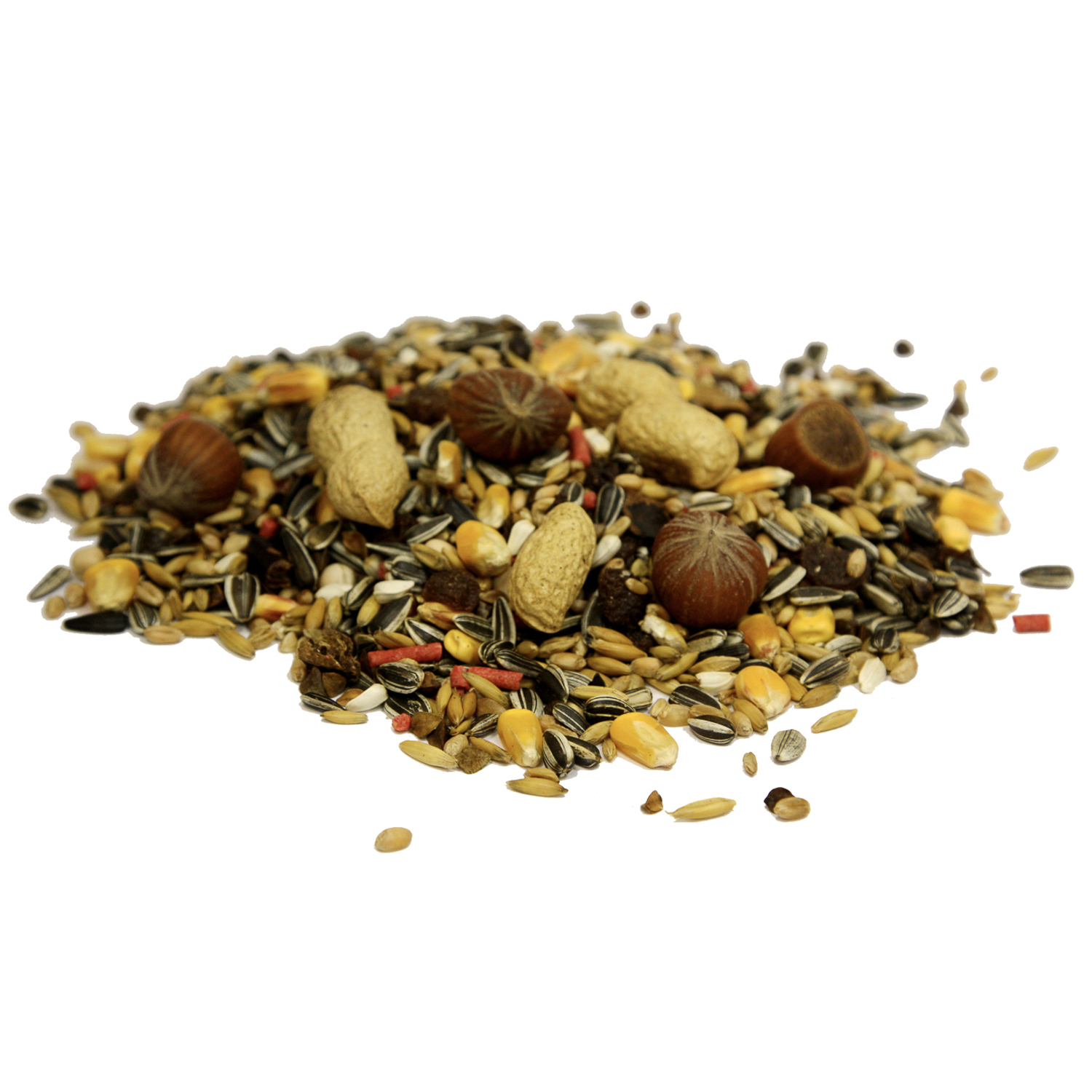 Семечки подсолнуха, овес цельный, пшеница, кукуруза, гречка, гранулы красные (пекарные продукты, злаки и зерновые продукты, мёд 10%, минеральные вещества, масла и жиры, фруктовые ароматизаторы, натуральные красители и антиоксиданты(одобрены ЕС). 4,5%, цельные лесные орехи 4,1%, неочищенный арахис 4,1%, бобы рожкового дерева, сафлор, изюм.
