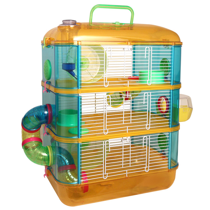 Яркая трехэтажная клетка прямоугольной формы — целый развлекательный комплекс для грызуна, который занимает немного места и отлично подходит для мелких домашних животных вроде крыс, мышей и хомяков. В комплектацию изделия также входят: пластиковая миска, поилка с носиком, уютный домик, труба-тоннель и беговое колесо. Кроме того, клетка оборудована удобной ручкой на крыше, облегчающей процесс переноски изделия. Размер изделия: 400х260х530мм.