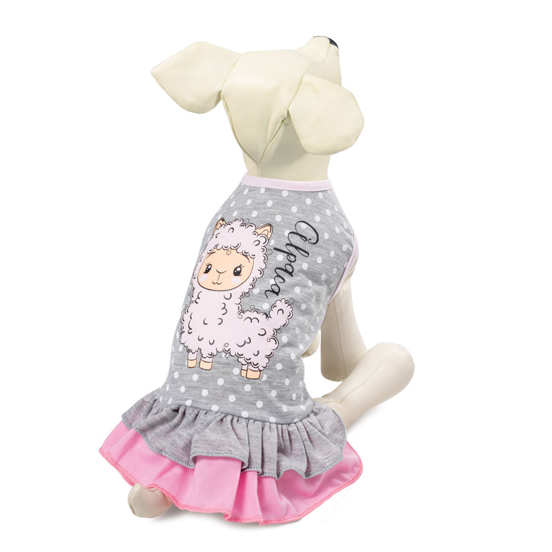 Летнее платье без рукавов «Альпака» с серо-розовой юбочкой и очаровательным рисунком сделает Вашу воспитанницу неотразимой. Специальный удобный крой гарантирует свободу движений, что немаловажно для прогулок. Подходит для собак мелких пород. Размер изделия: 200х340х240мм. Цвет: серый.