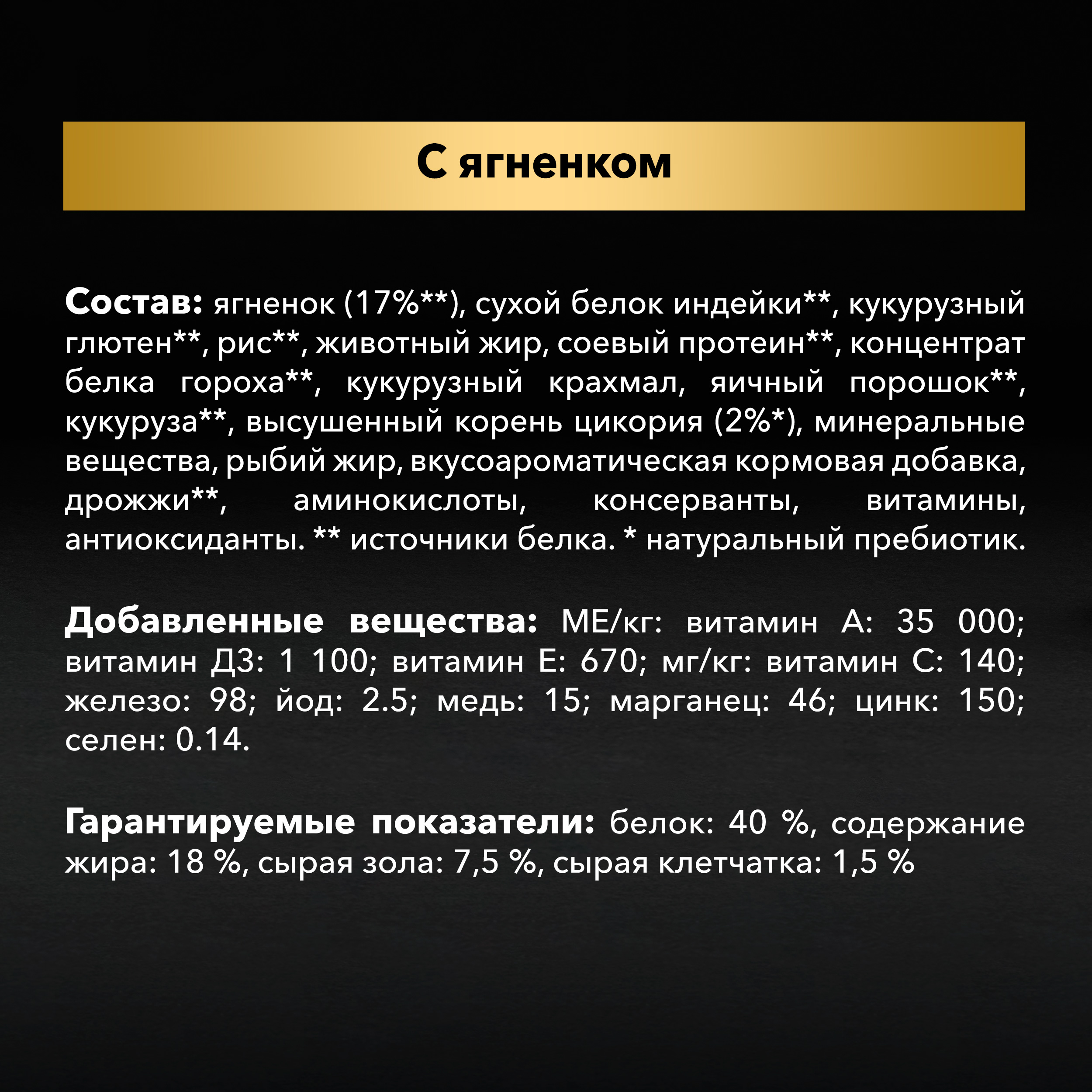 ягненок (17%**), сухой белок индейки**, кукурузный глютен**, рис**, животный жир, соевый протеин**, концентрат белка гороха**, кукурузный крахмал, яичный порошок**, кукуруза**, высушенный корень цикория (2%*), минеральные вещества, рыбий жир, вкусоароматическая кормовая добавка, дрожжи**, аминокислоты, консерванты, витамины, антиоксиданты.