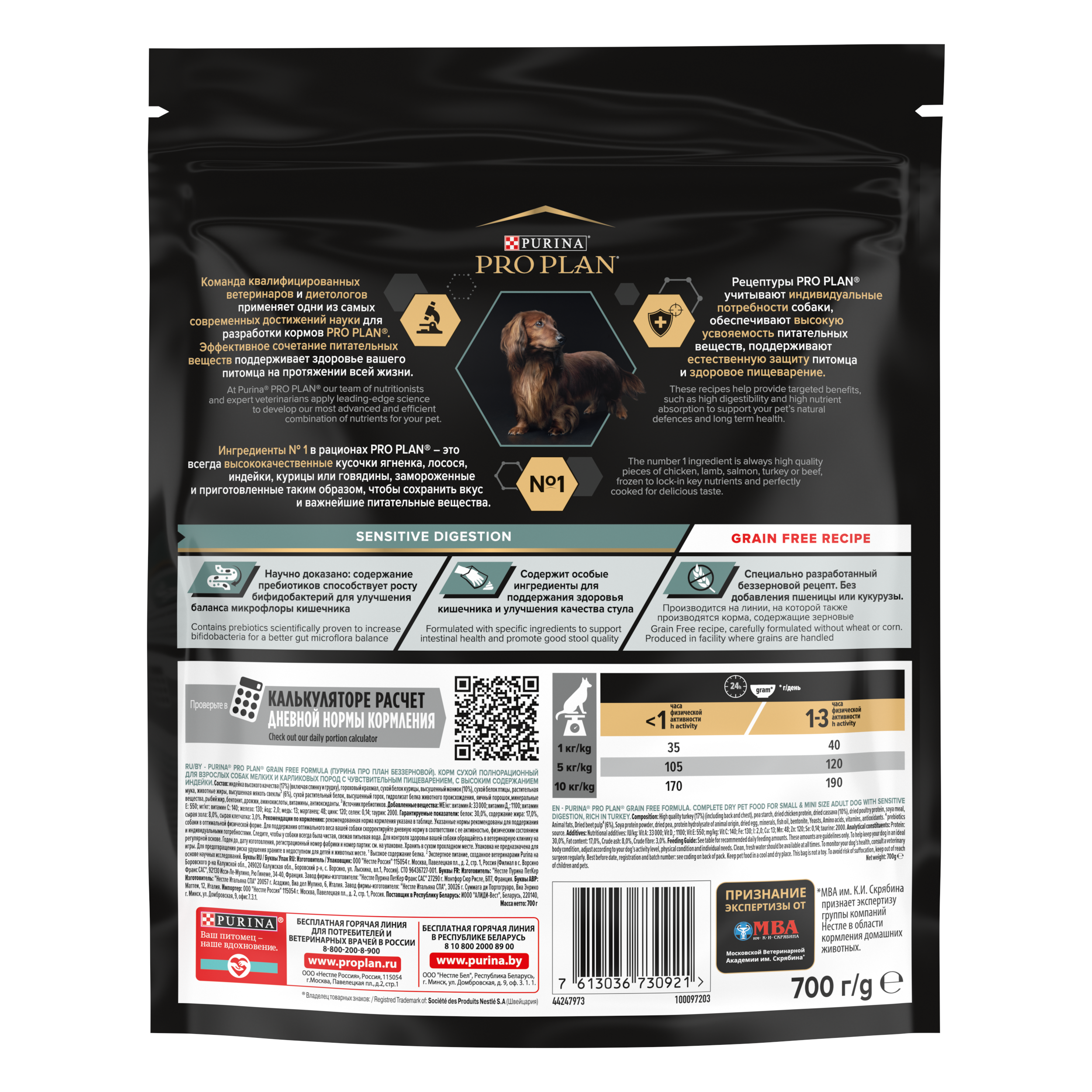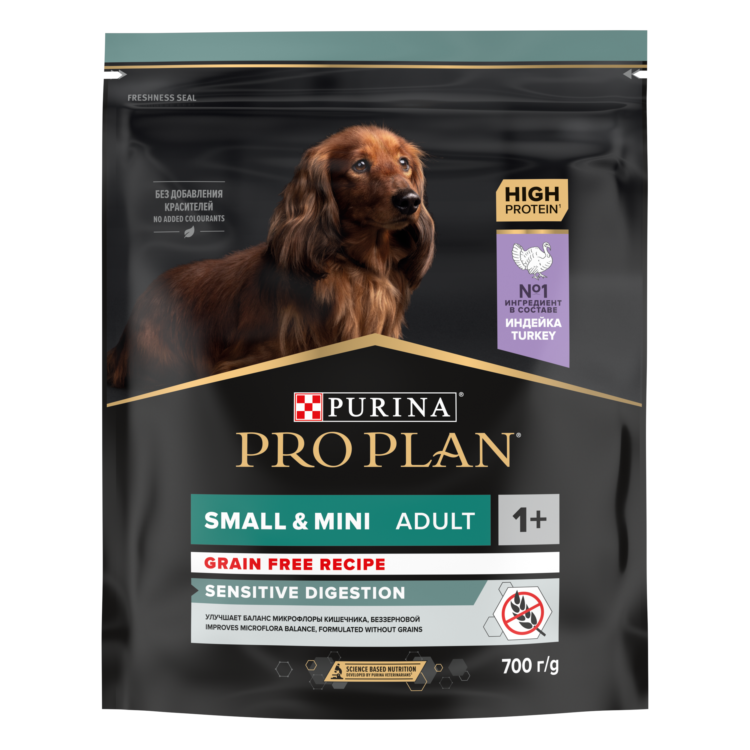 Сухой корм PRO PLAN® для взрослых собак мелких и карликовых пород с чувствительным пищеварением GRAIN FREE (беззерновой), с высоким содержанием индейки 700 г