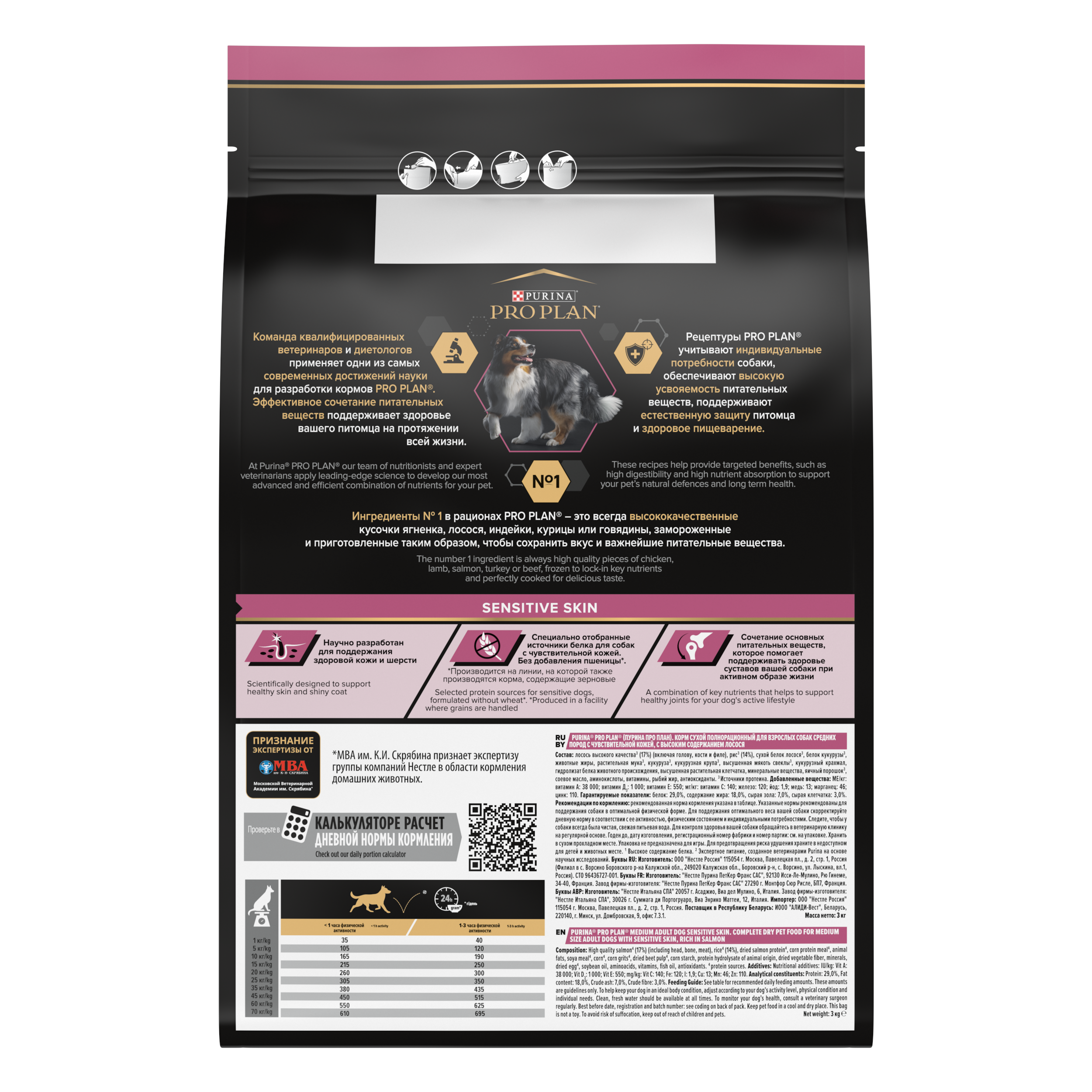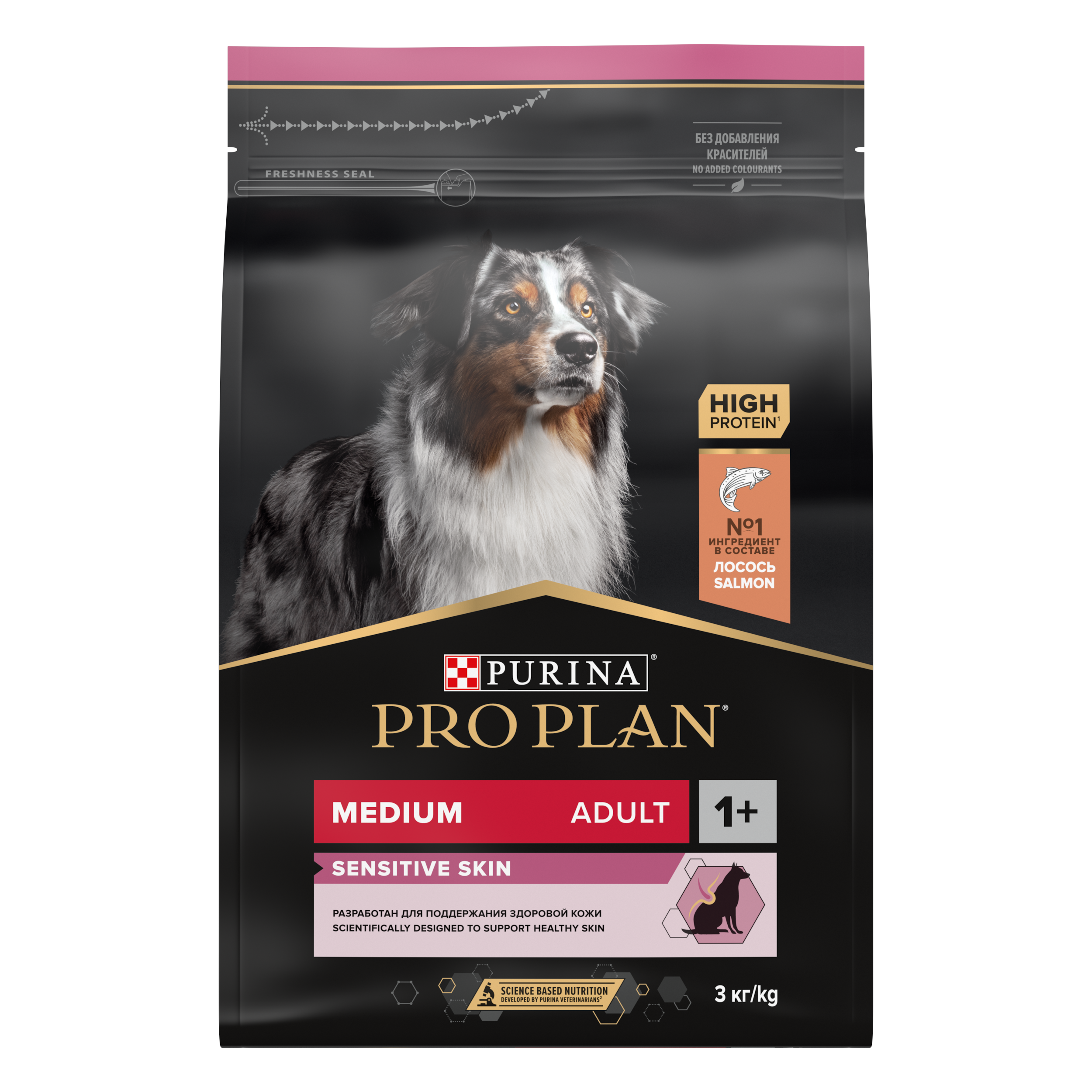 Изучая потребности собак на протяжении многих лет, команда квалифицированных ветеринарных специалистов и диетологов PURINA разработала сухой корм PRO PLAN® Sensitive skin — ежедневный рацион с высоким содержанием лосося для собак средних пород.. Этот полнорационный корм полностью сбалансирован по составу и помогает поддерживать здоровье чувствительной кожи.