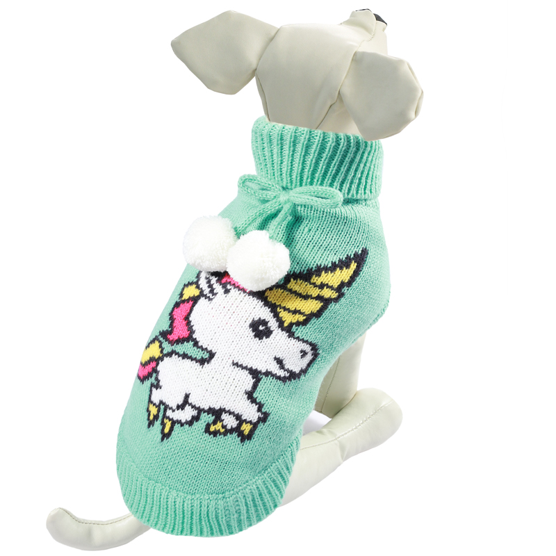 Теплый и оригинальный свитер с изображением единорога — это удобный и функциональный аксессуар для собак, который просто незаменим в холодную погоду. Изделие защитит вашего питомца от ветра и согреет в непогоду. Свитер имеет стильный дизайн, а универсальный фасон не стесняет движений питомца во время прогулки. Вывязанная резинка по всему периметру низа изделия обеспечивает плотное прилегание свитера к телу, ворот украшен помпонами. Такой свитер с модным принтом станет украшением гардероба вашего питомца. Материал: акрил. Цвет: мятный. Размер: 45см (XXL).