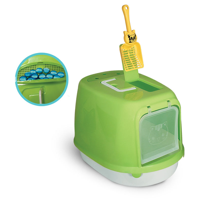 Туалет для кошек закрытый со сменным угольным фильтром, совком и ароматизированными гранулами в комплекте. Туалет-бокс – это не просто стильный, но и функциональный аксессуар для владельцев пушистых питомцев. Такой туалет прекрасно удерживает запах благодаря сменному угольному фильтру, а закрывающаяся дверца предотвращает рассыпание наполнителя за пределы лотка. Туалет изготовлен из износостойкого пластика и легко моется под струей воды. Цвет поддона: белый. Цвет бокса: салатовый, желтый. Размер туалета: 500*350*340мм. Размер совка: 250*95*30мм.