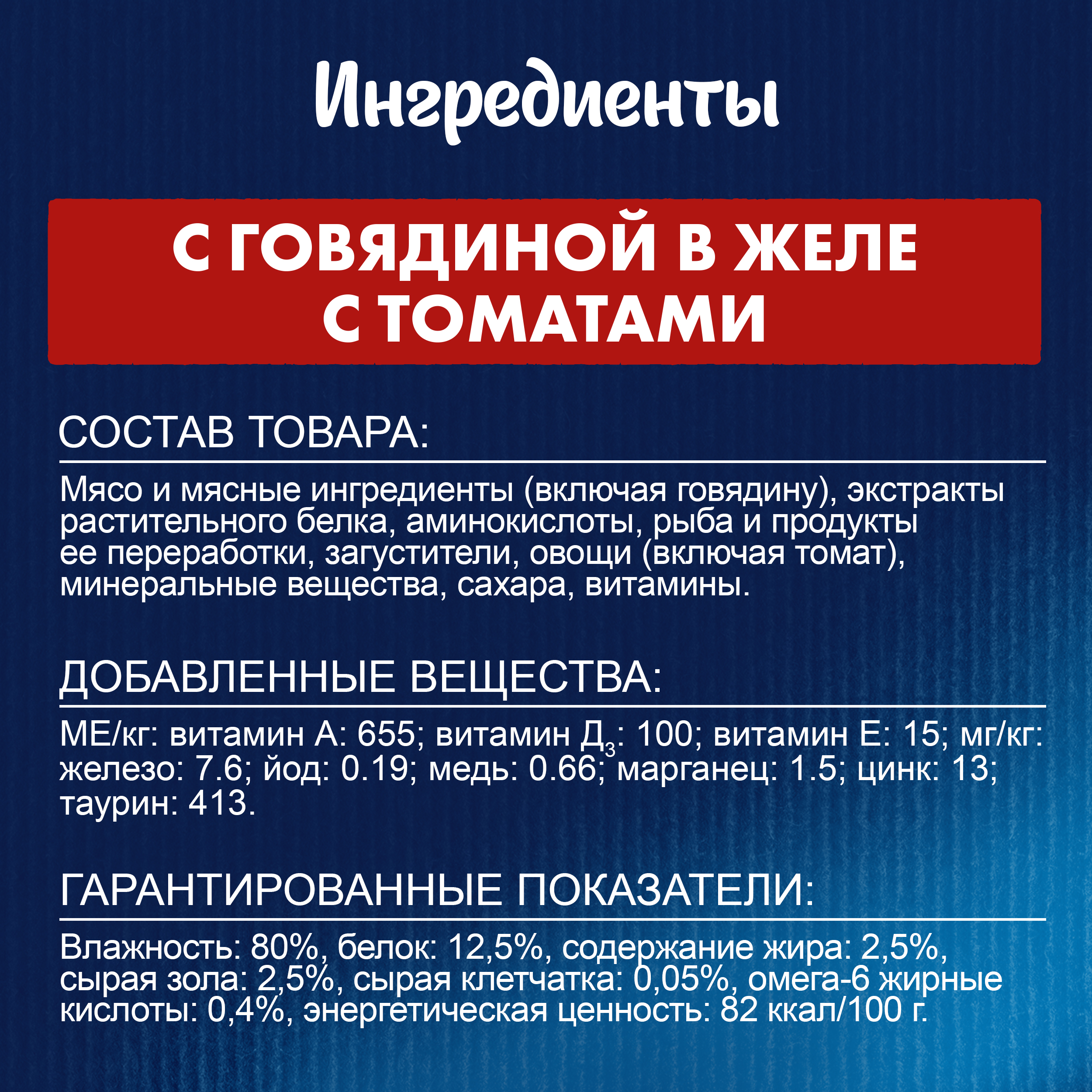 мясо и мясные ингредиенты (включая говядину), экстракты растительного белка, аминокислоты, рыба и продукты ее переработки, загустители, овощи (включая томат), минеральные вещества, сахара, витамины.